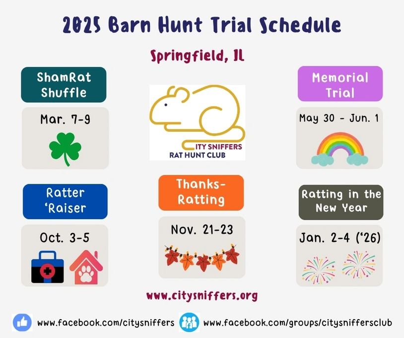 City Sniffers Rat Hunt Club, a division of City Sniffers Dog Sports Training, will host a 3-day Barn Hunt trial on November 21-23, 2025, at our facility in downtown Springfield, IL. Download the premium at the link below for additional details and class running orders.